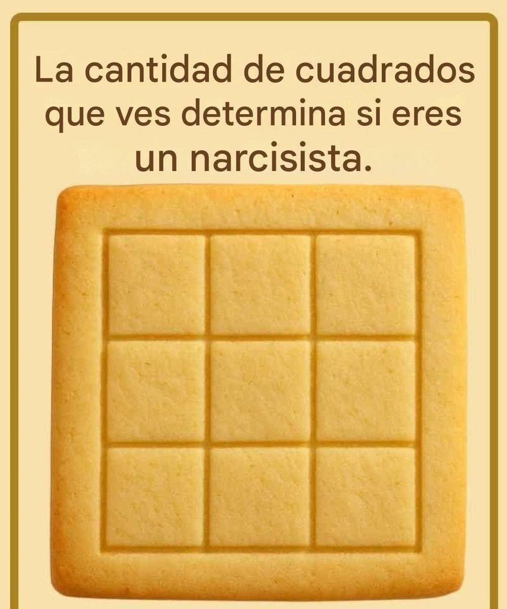 A primera vista, esta sencilla imagen, parecida a una galleta, parece inofensiva: solo una cuadrícula tallada en la masa. Pero la pregunta que la acompaña, «El número de cuadrados que ves determina si eres narcisista», hace que todos se detengan a pensar. Es una divertida ilusión psicológica que se ha viralizado en internet, generando miles de debates. Exploremos qué revela este acertijo sobre tu forma de pensar, tu capacidad de observación y, sí, si acaso ocultas ciertas tendencias narcisistas bajo esa apariencia tranquila.