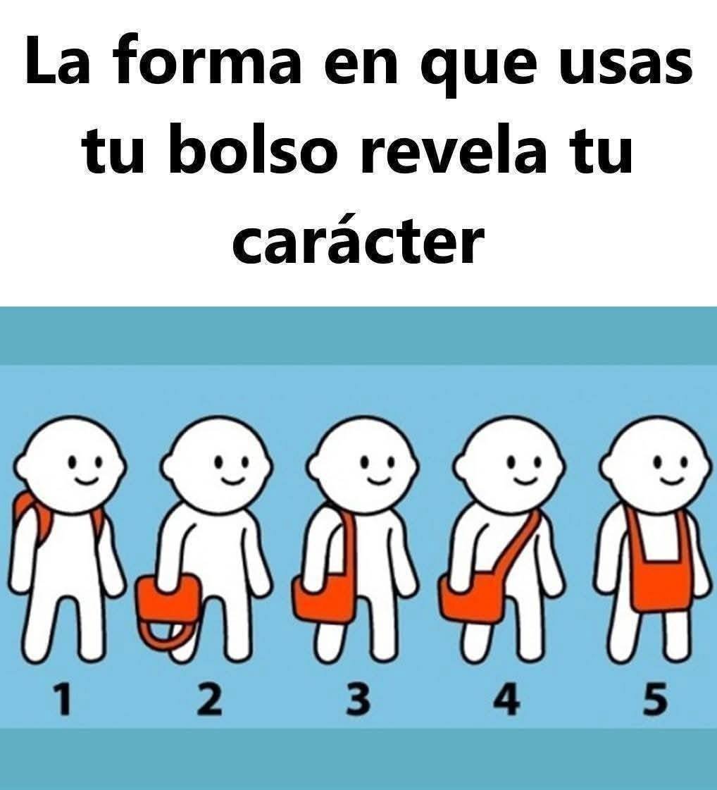 2. Llevar en la mano Si te gusta llevar tu bolso y otras pertenencias en la mano, significa que te gusta hacer todo completamente y tener el control de todo. Siempre quieres estar informado de lo que pasa y tienes una opinión sobre todo. Eres una persona sencilla pero también confiable.3. Sobre el hombro A las personas a las que les gusta llevar el bolso al hombro normalmente también les gusta leer. Esta posición les permite sacar su libro favorito del bolso en un abrir y cerrar de ojos.